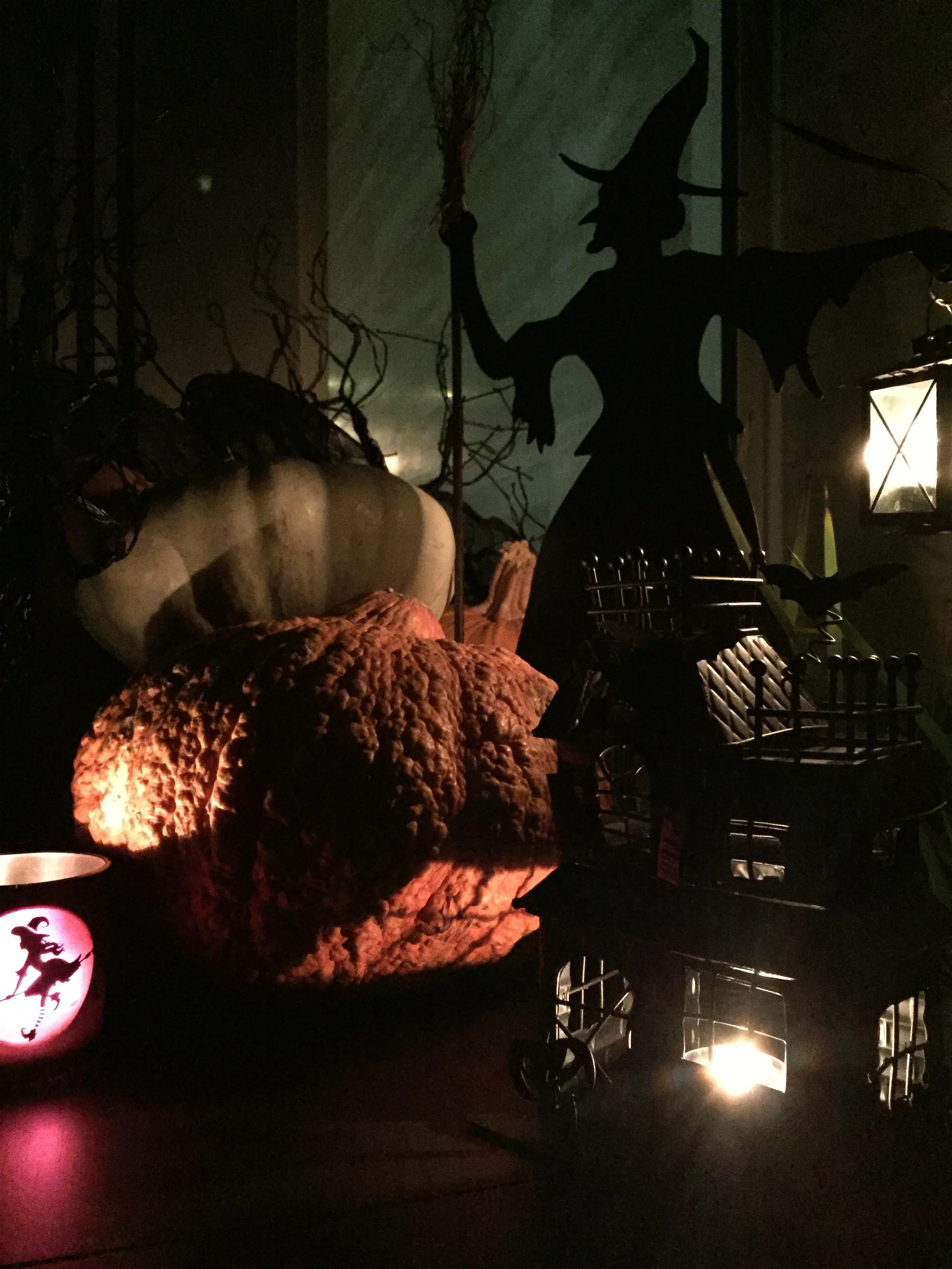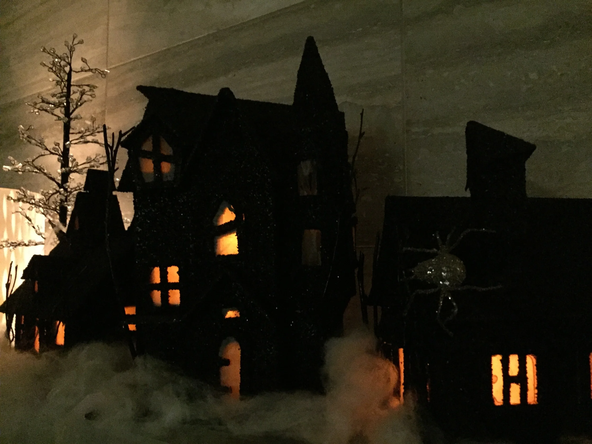 Decor: Spooky Glitter Buildings (Pottery Barn Fall 2015)/small LED string wire lights (orange)/kids ceramic designs/lots of candles/"white spider webbing"- can spread large to look like webs or keep bunched up to look like fog