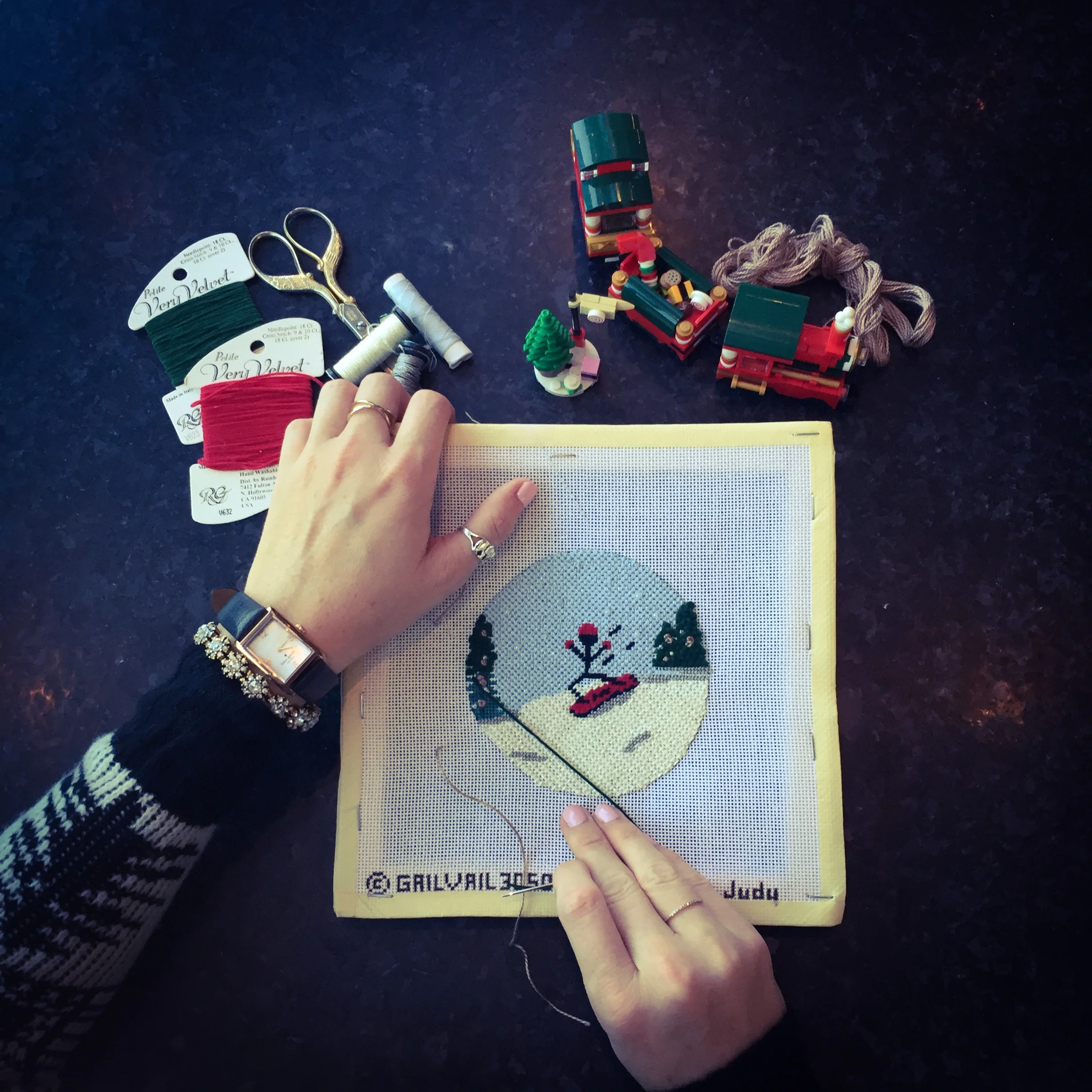 My mom, my Nana and my aunts have been needle-pointing for years. I once tried to learn when I was in elementary school but the hobby didn't stick; looking back I would venture to say its because I didn't like my canvas. Just after this past holiday season, I decided to try again. My Mom and I went into her favorite needlepoint store and 30 minutes later, we left canvases in hand. Then came the giant boxes of thread she and Nana had gathered over the years- matched thread to paint color and the lessons began.